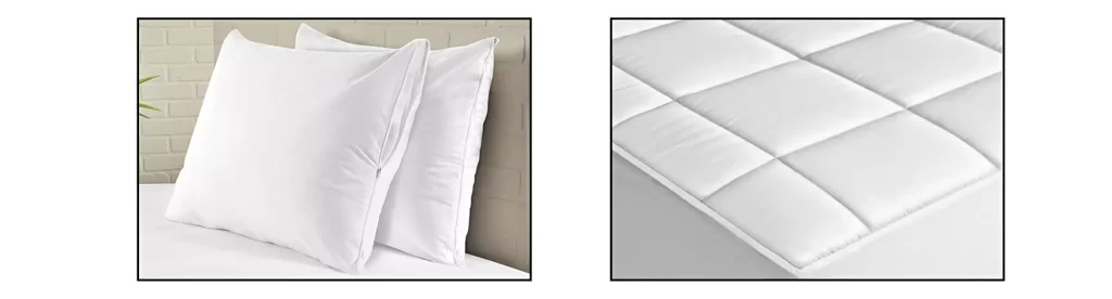 Mattress Pads – Plush 4.7 oz. fiber fill with quilted top. Elastic skirt fits mattresses 14″ deep. Waterproof.