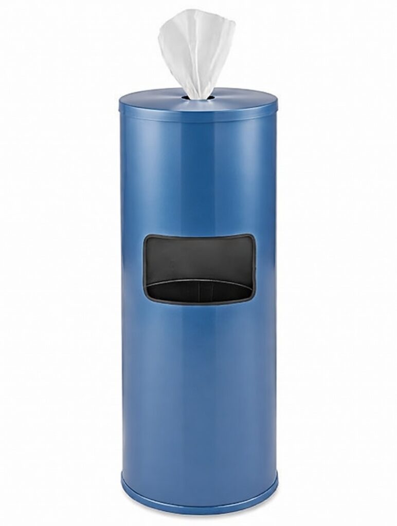Upscale floor dispenser used in health clubs and yoga studios to dispense sanitizing wipes.