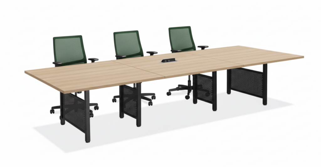 1 1/4″ thick laminate top with beveled edges and silver trim. 2 cable grommets.