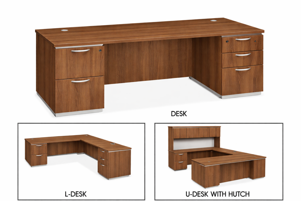 U-Desk – Wraparound design. Convenient pop-up power center. 4 cable grommets. Available with overhead hutch for additional storage.