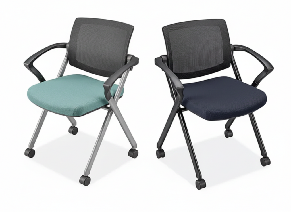 2 1/2″ thick seat flips up to nest for compact storage.