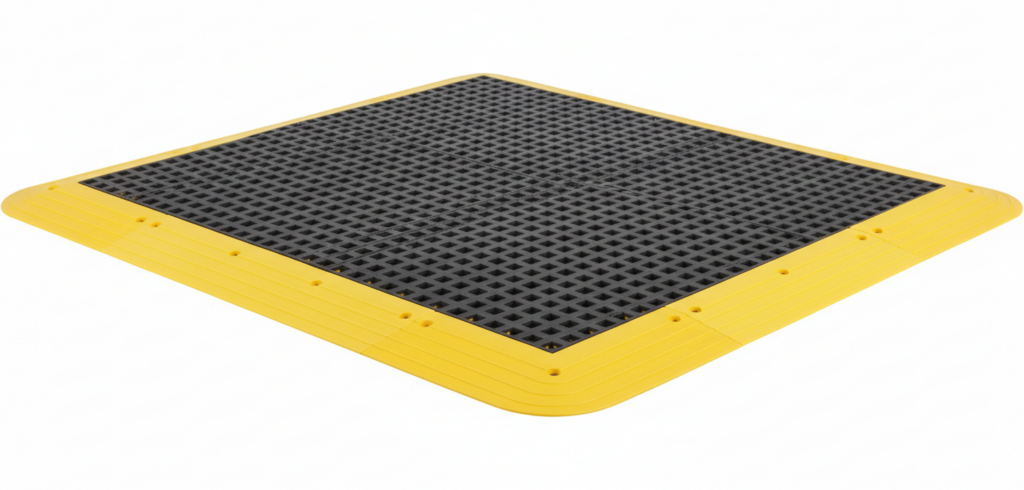 Anti-fatigue matting with a domed air cushioned surface which is designed to provide optimal comfort and improve circulation. Manufactured with heavy duty flexible rubber, this mat is an ideal option for comfort and safety in medium and heavy duty industrial environments.