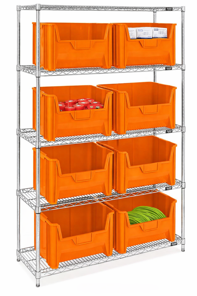 Open wire shelving prevents dust buildup and maximizes airflow.