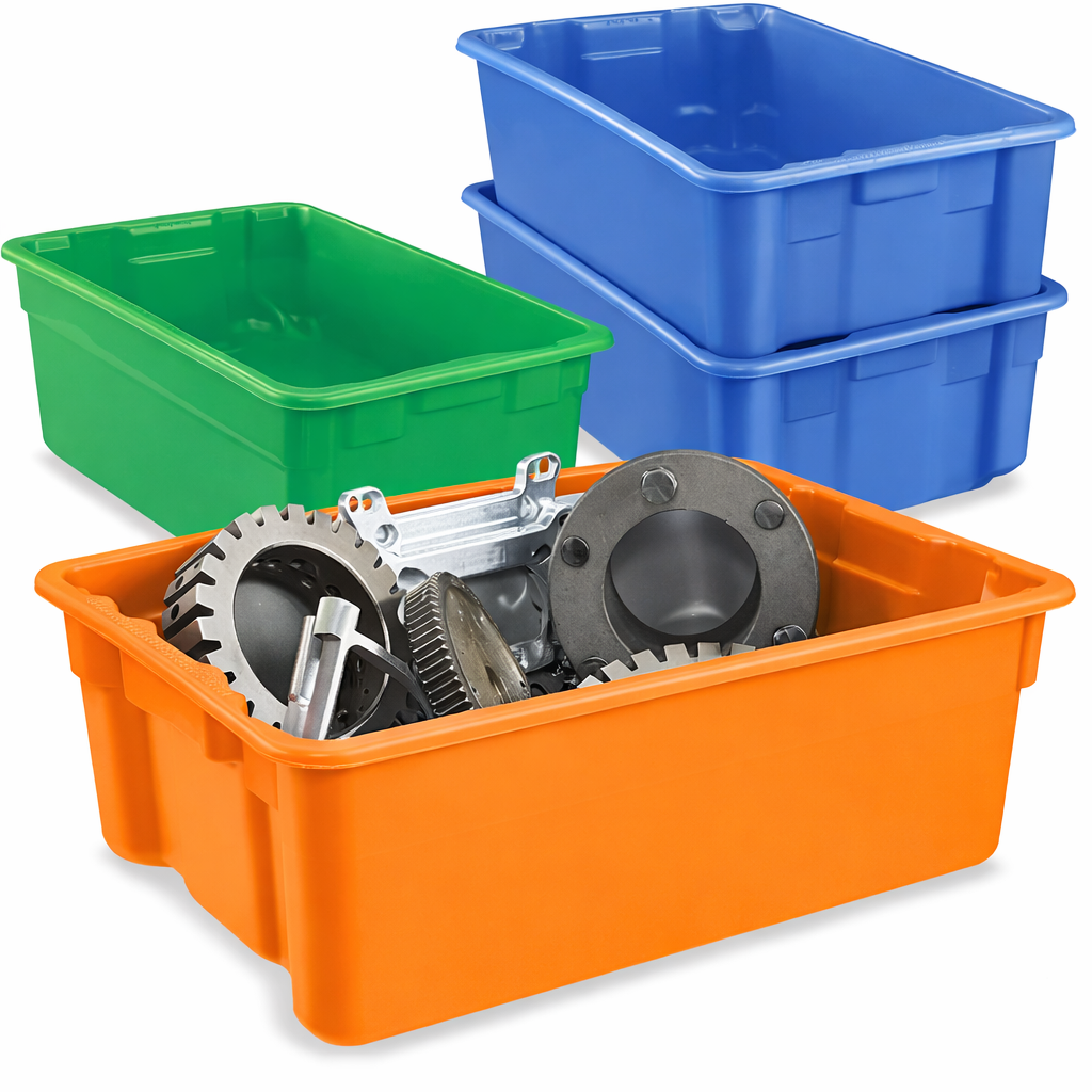 Stack when full or nest when empty. 3,000 lb. stacking strength.