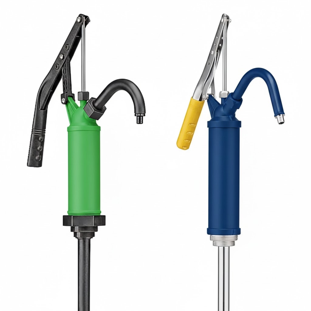 Hand crank dispenses liquids in cabinets and confined spaces.
