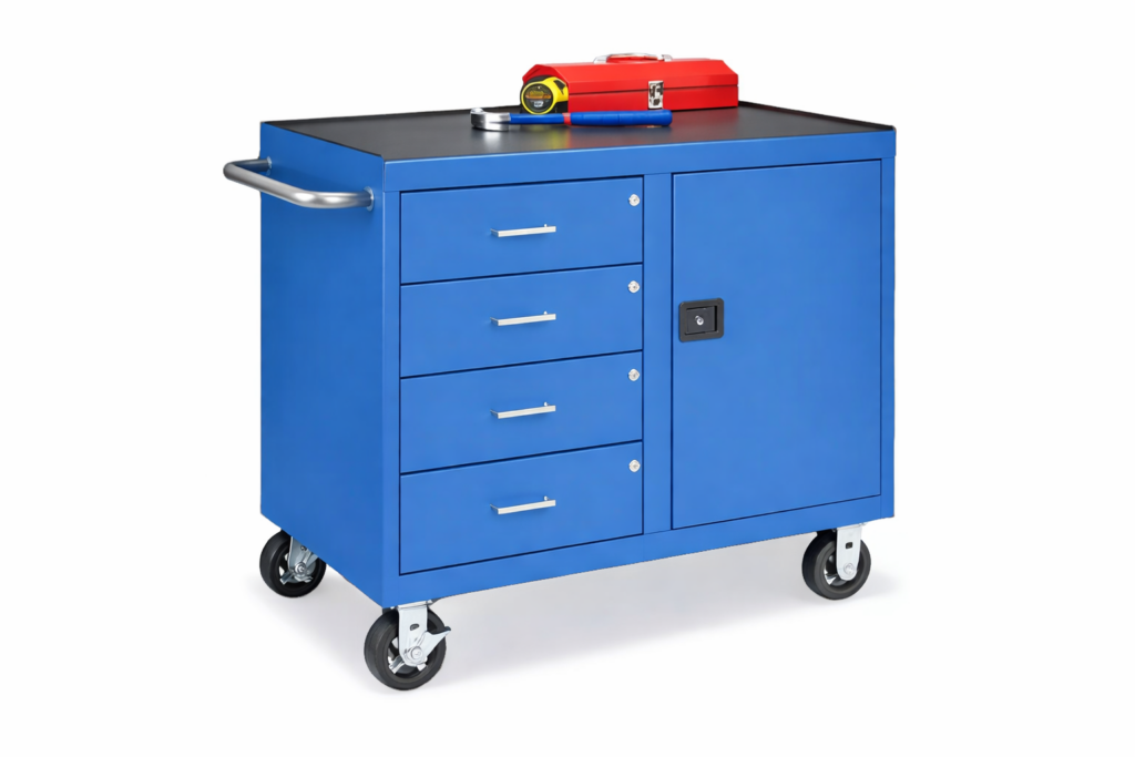 Heavy duty, all-welded steel construction. Convenient push handle.