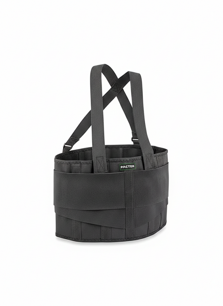 Flexible, ventilated elastic belt. Removable, adjustable shoulder straps.