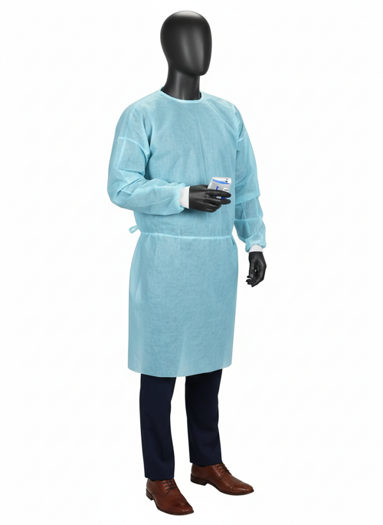 SMMS 4-layer polypropylene. Ties at neck and waist; knit wrists.