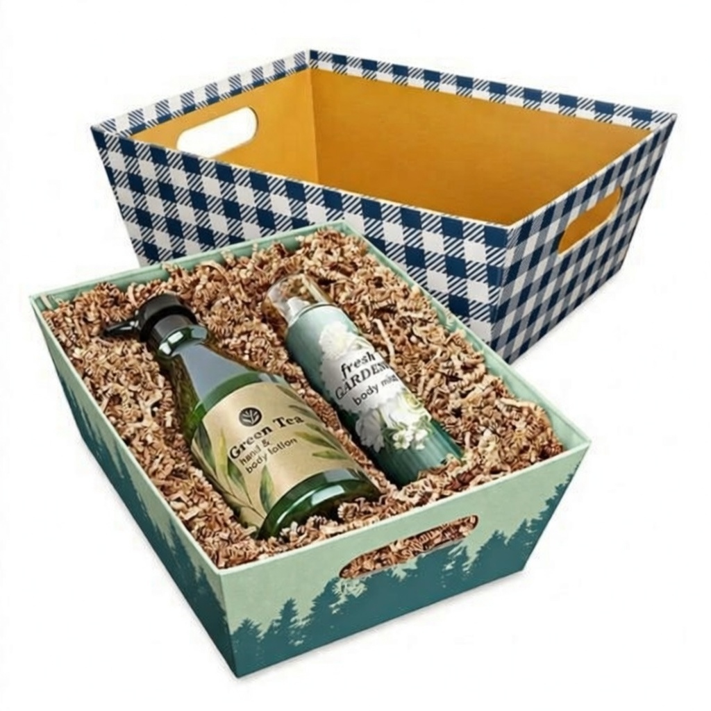 Thick, sturdy paperboard with die-cut handles.
