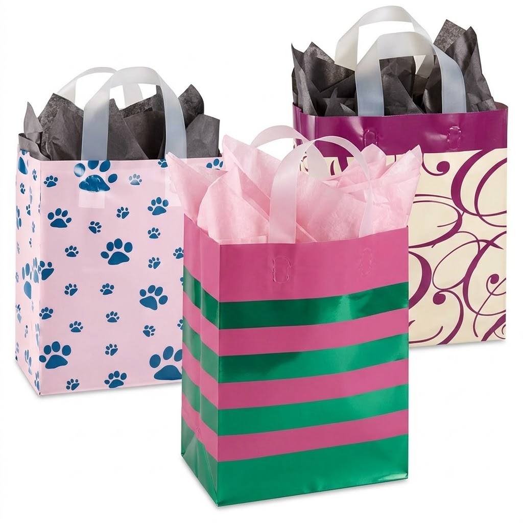 Distinctive patterns add dramatic flair to these natural kraft shoppers.