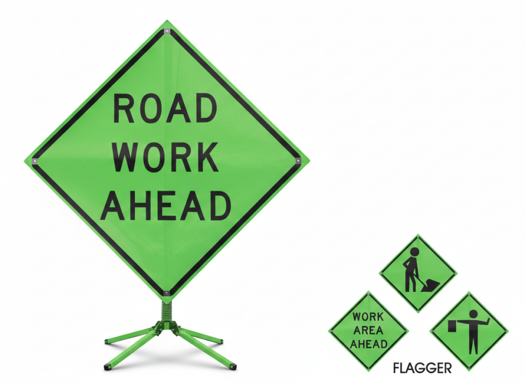 Super-sized 48 x 48″ “Big Suckers” alert drivers of work areas and hazards.