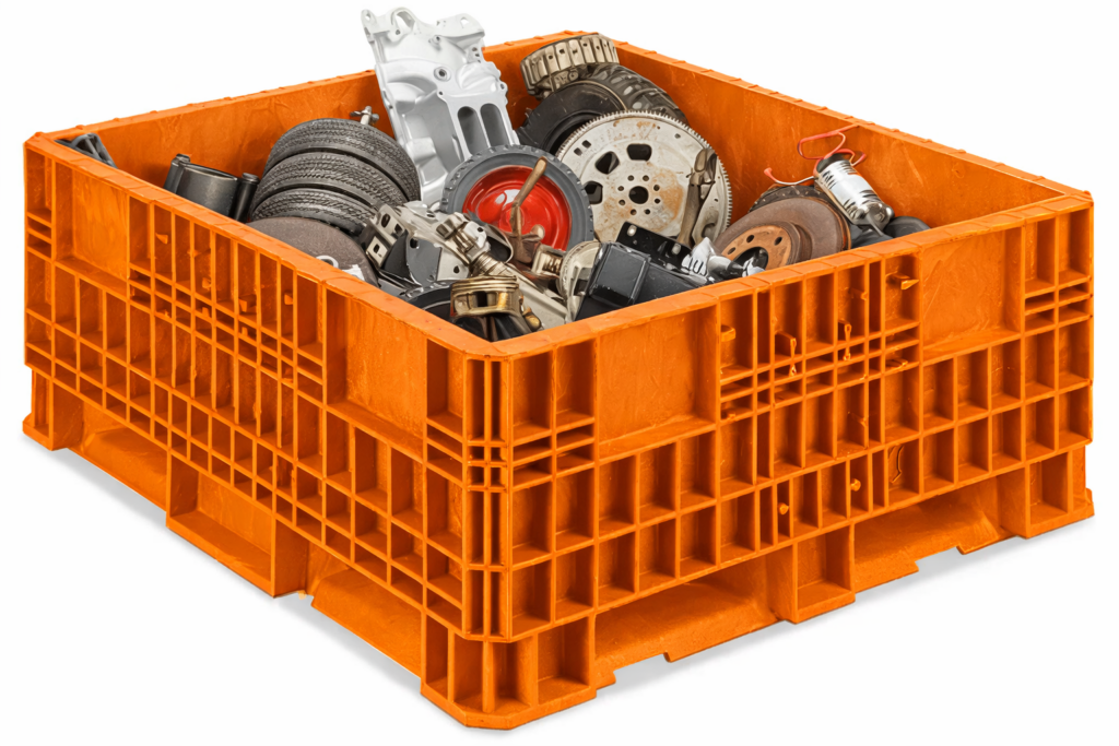 Short, fixed-wall containers for automobile components, bearings and industrial parts.