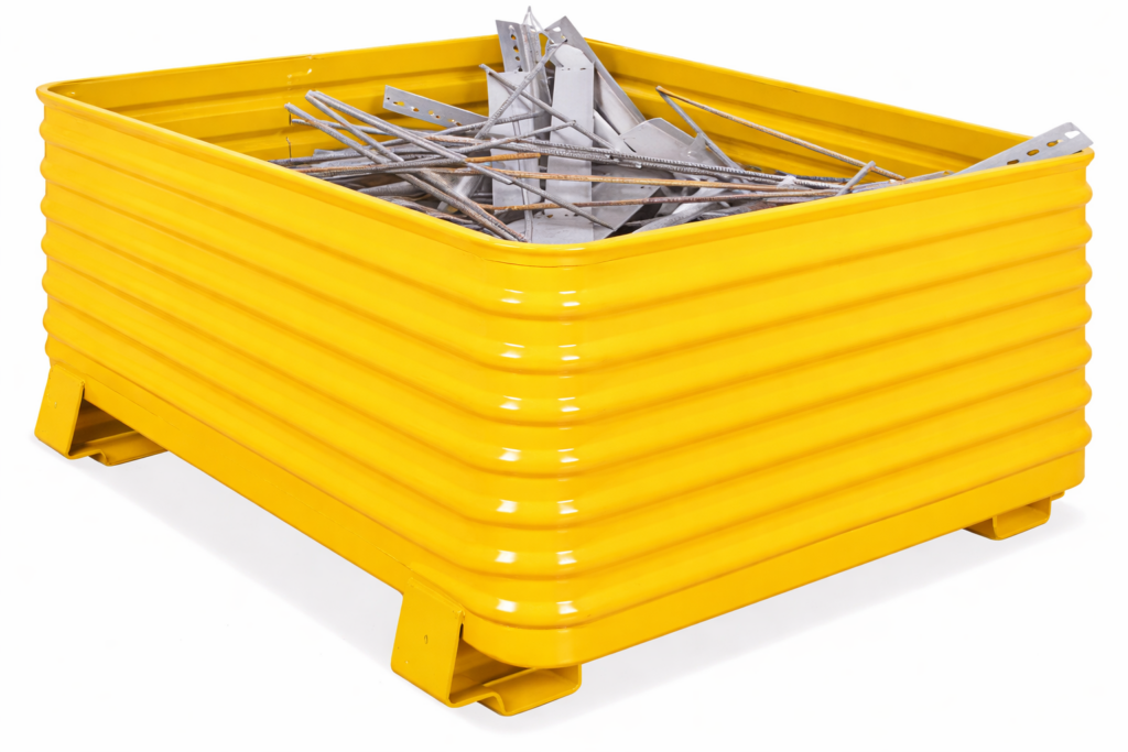 All-welded corrugated steel. Holds up to 2 tons of heavy parts or industrial scrap.