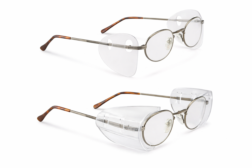 Deluxe Side Shields – Reusable. Flexible clear PVC absorbs impacts. Blocks 99.9% UV.