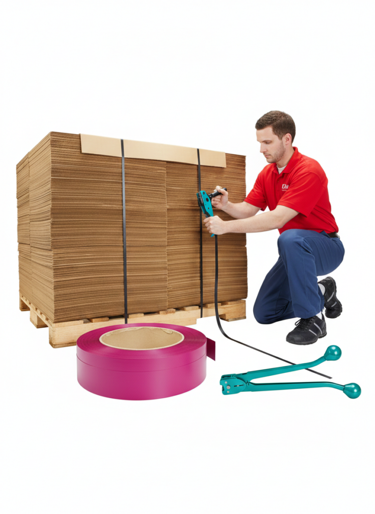 Strong polypropylene strapping is 1/2 the weight of steel strapping.
