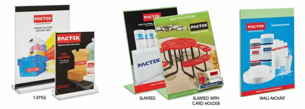 Slanted Sign Holders – Shows off single-sided materials. Side loading.