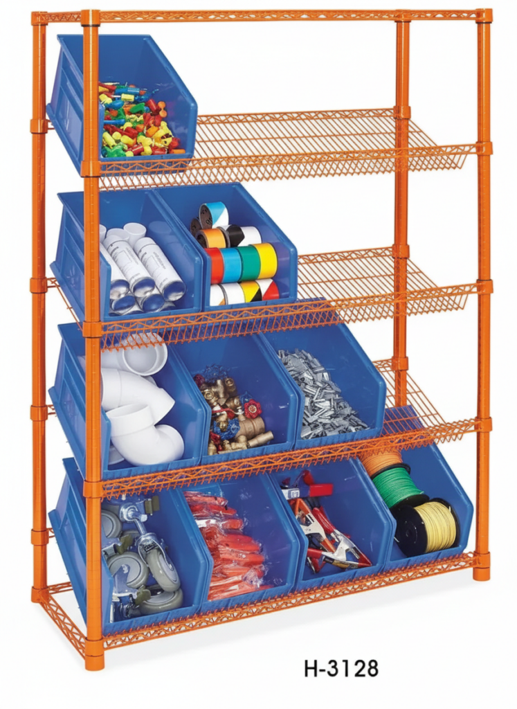 5 Shelf Unit with Bins – Includes 16 durable plastic stackable bins for small parts storage.