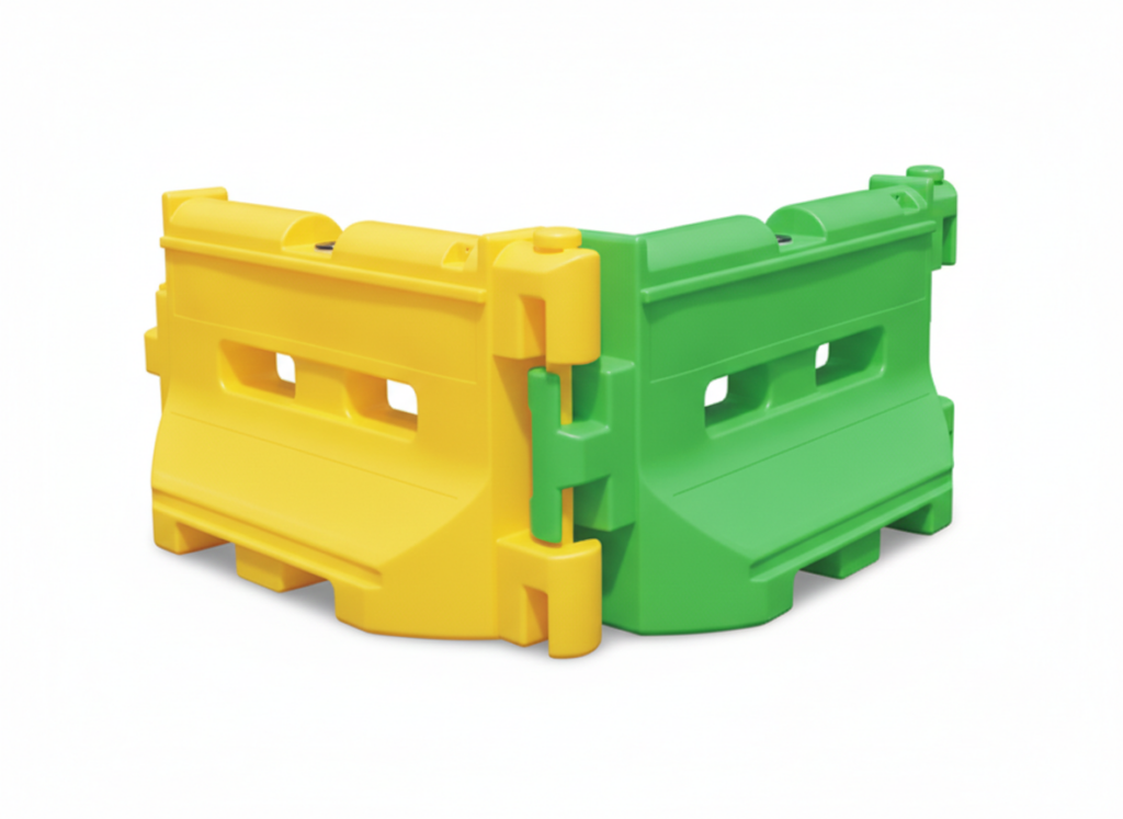 Interlocking pin allows barriers to connect and rotate up to 90°.