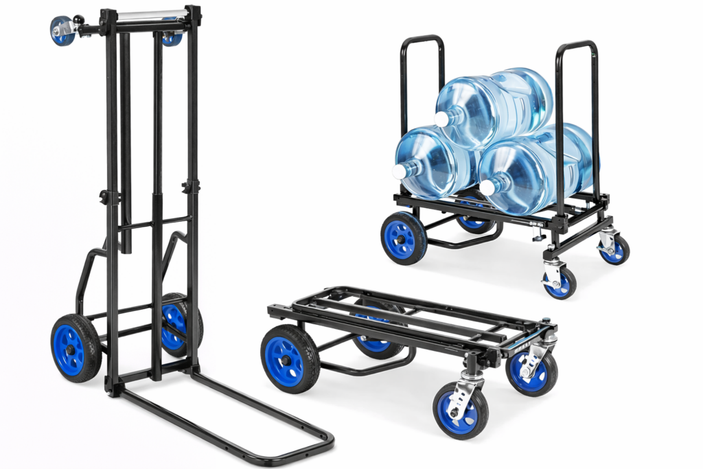Instantly converts from platform truck to dolly or hand truck.