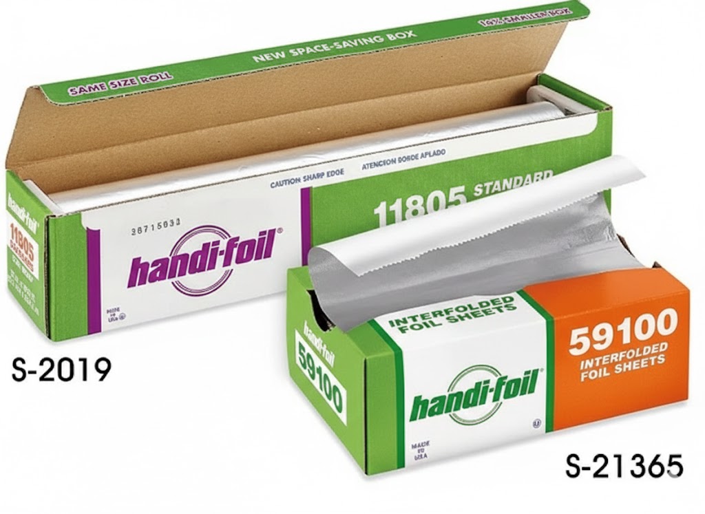 Pre-cut Sheets Aluminum Foil – Interfolded, precut foil sheets pop up for one-at-a-time dispensing.