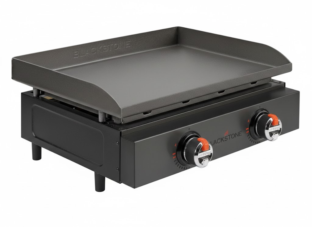 Steel flat-top cooking surface. 2 independent burners. 21,000 BTUs.