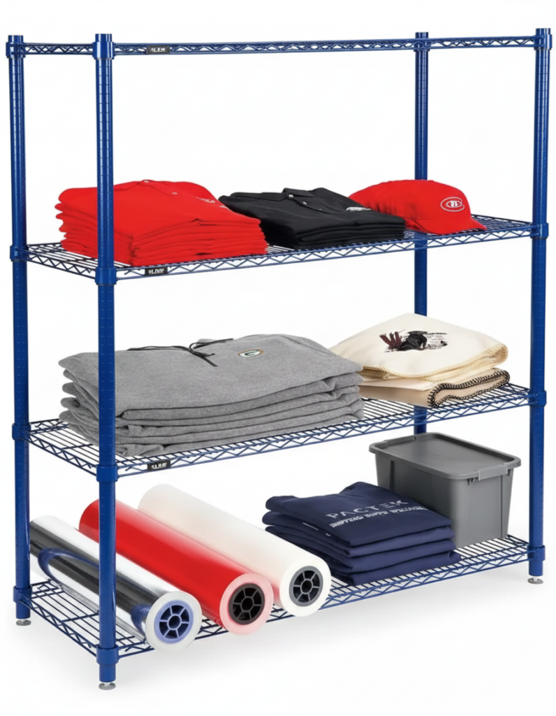 Decorative heavy-duty black wire shelving looks good in offices, stores and warehouses.