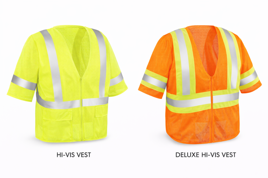 Deluxe Hi-Vis Vest: Contrasting reflective stripes on sleeves, shoulders and chest. 1 inside pocket.