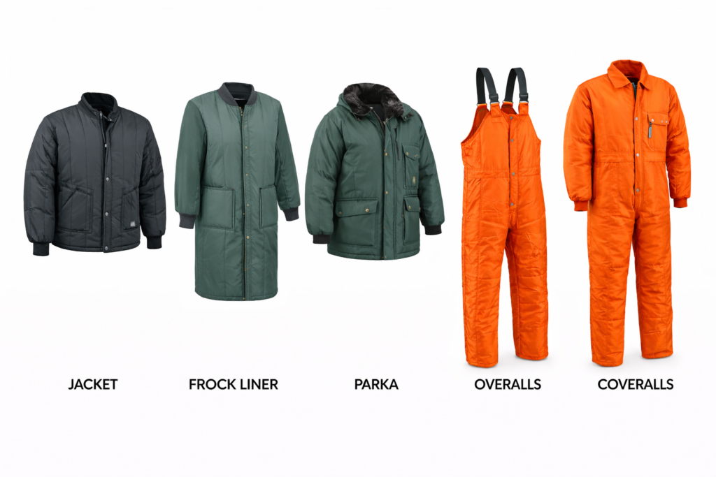 Coveralls – Complete freezer suit for all-day, constant cold. Zip front and legs with storm flaps, 3 pockets, fleece neck.
