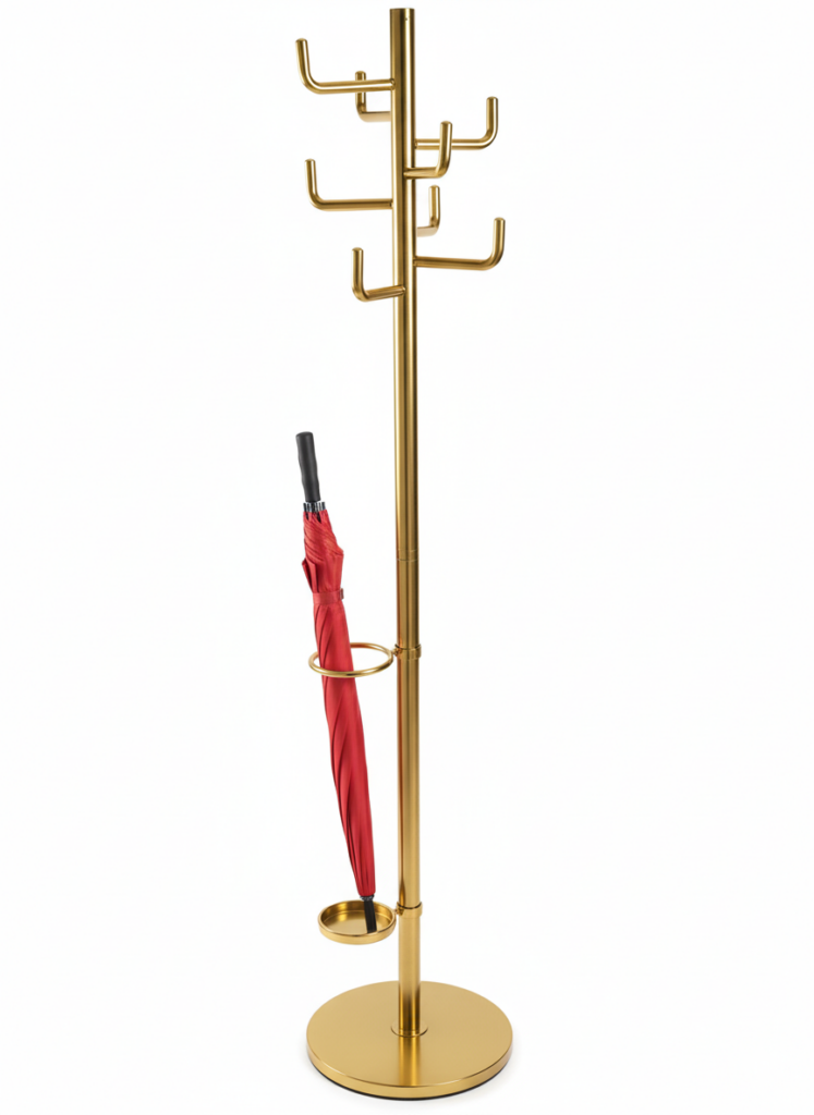 Includes 8 hooks, adjustable height umbrella holder and drip tray.