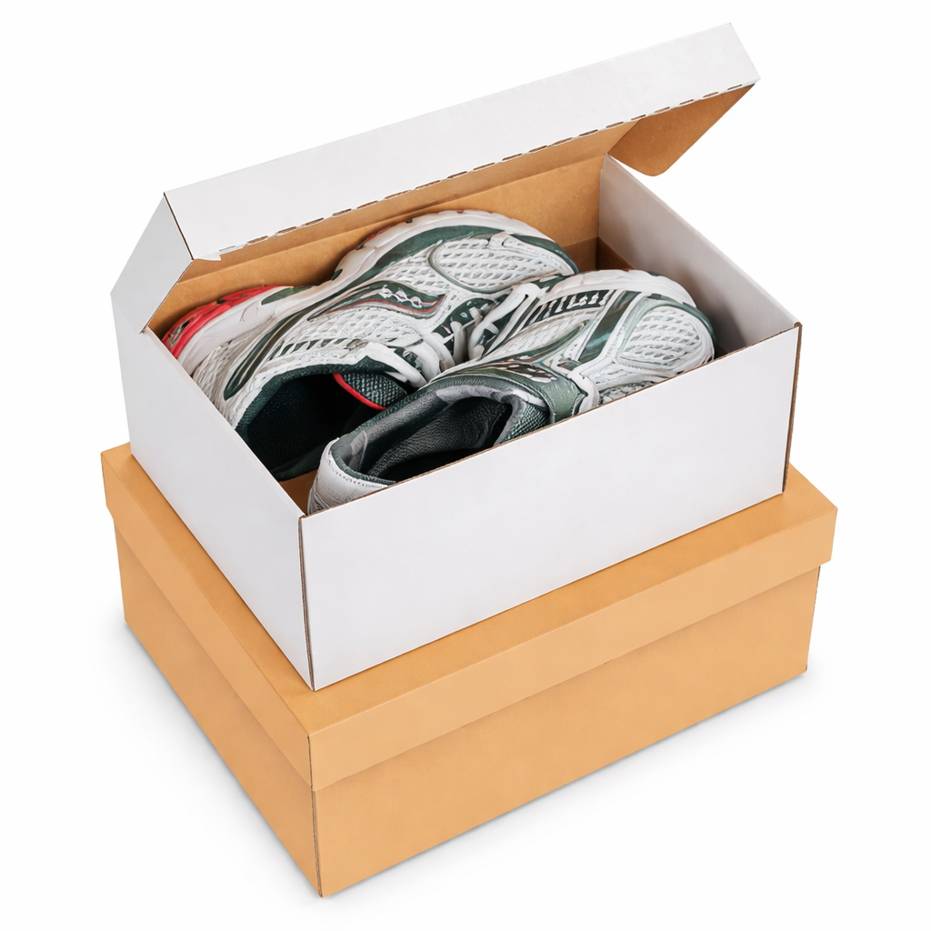 Strong one-piece box for shipping or storing shoes.