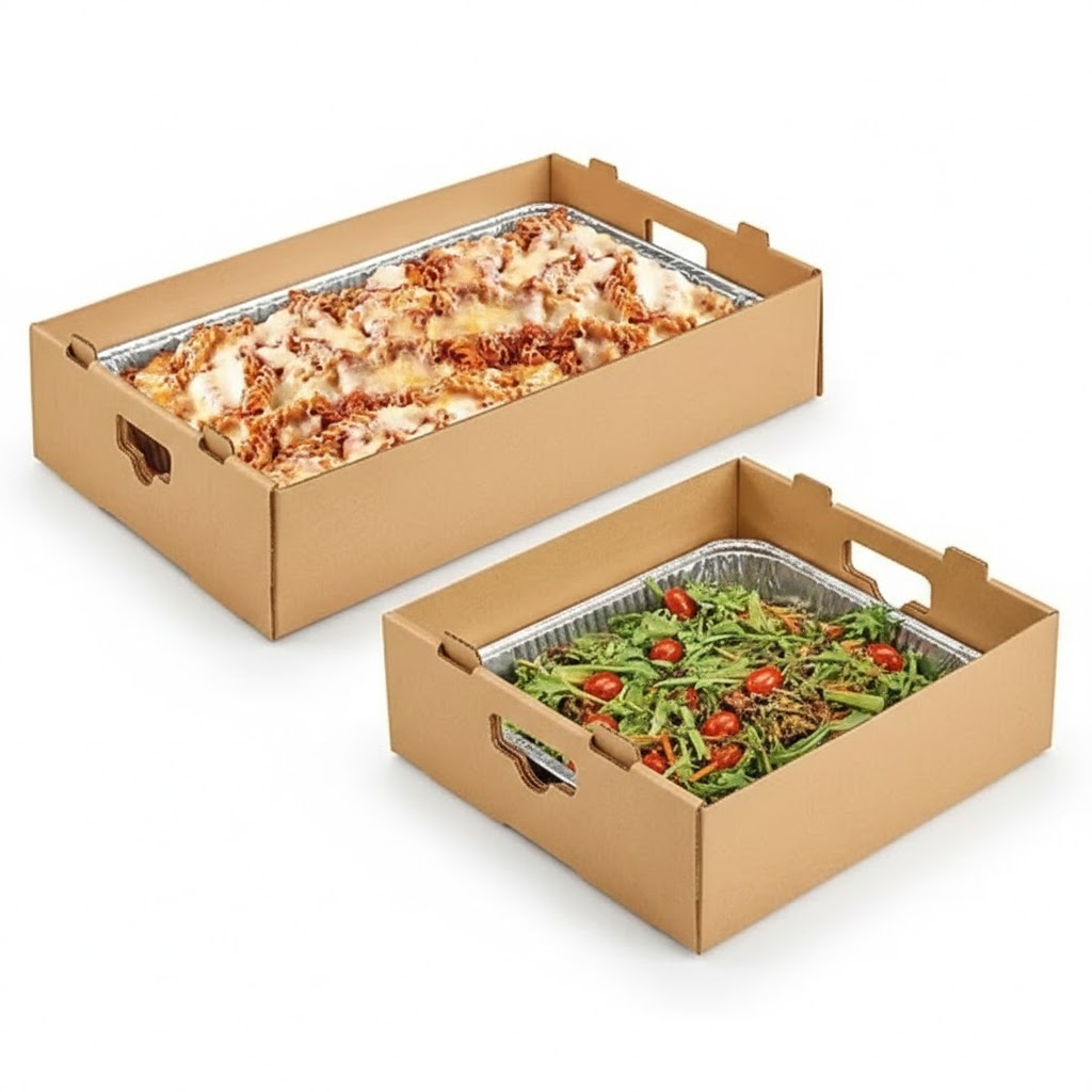 Die-cut handles for carrying heavy aluminum pans.