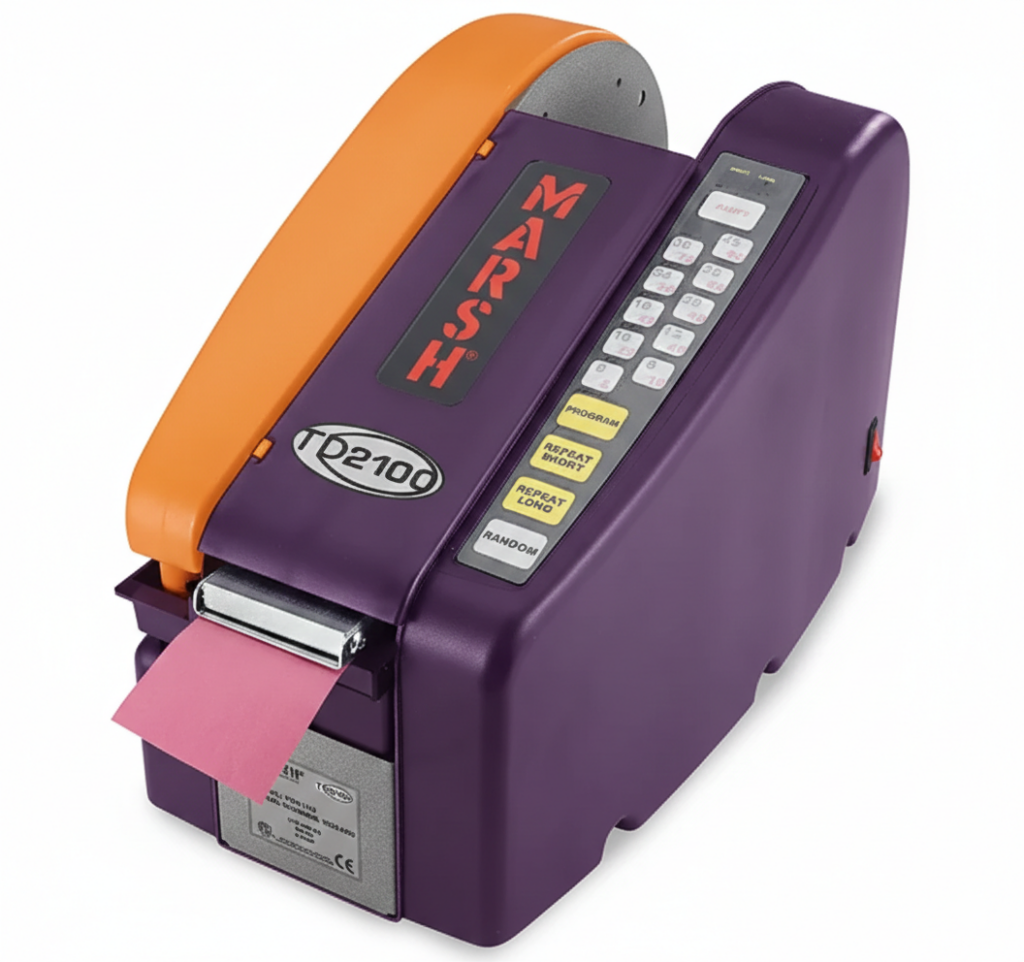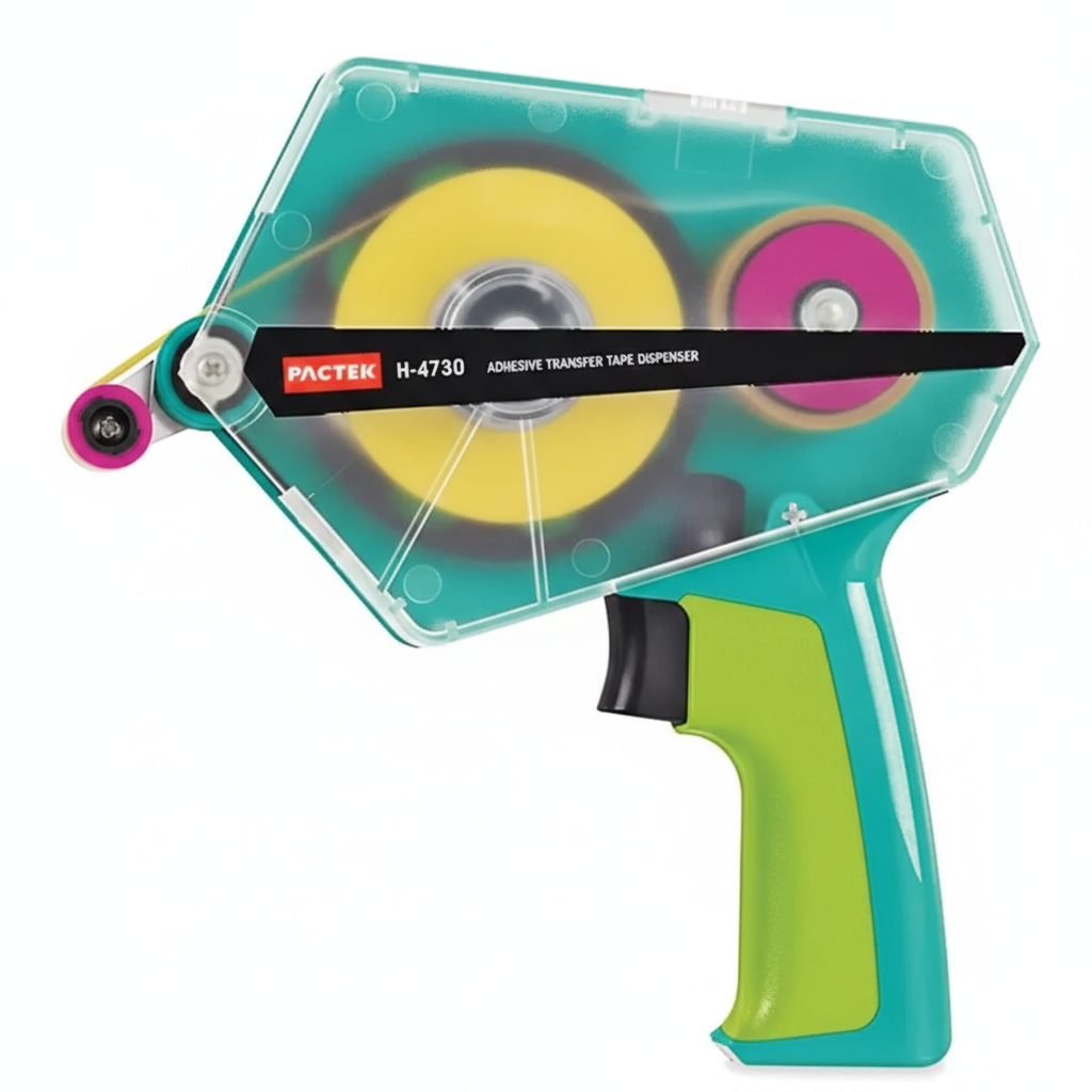 No blade needed – tape breaks apart when dispenser is lifted. Liner rewinds automatically inside.