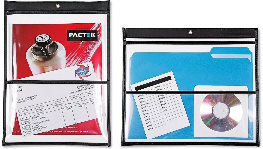 Large pocket holds job tickets, brochures and catalogs.