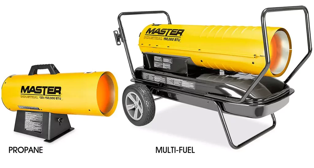Multi-Fuel – Uses kerosene, diesel or fuel oil to produce large volumes of heated air. Digital temperature display and fuel gauge. 10″ heavy-duty wheels included.