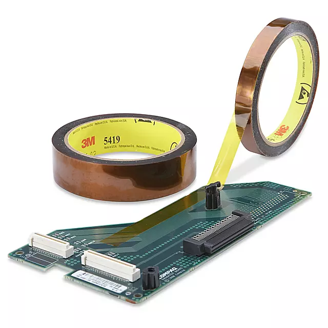 Protects gold tabs in circuit boards during soldering. Low electrostatic discharge during application and removal. Flame resistant. RoHS compliant. Resists temperature extremes from -100°F to 500°F. Gold translucent film with silicone adhesive.