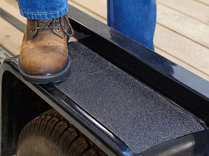 When safety matters most. Recommended for use on farm and construction equipment. Works on wet, muddy and greasy areas. Coarse mineral polymer. Pressure-sensitive adhesive bonds on contact.