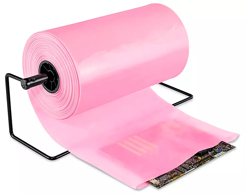 Static dissipative, non-corrosive pink polyethylene is heat sealable.