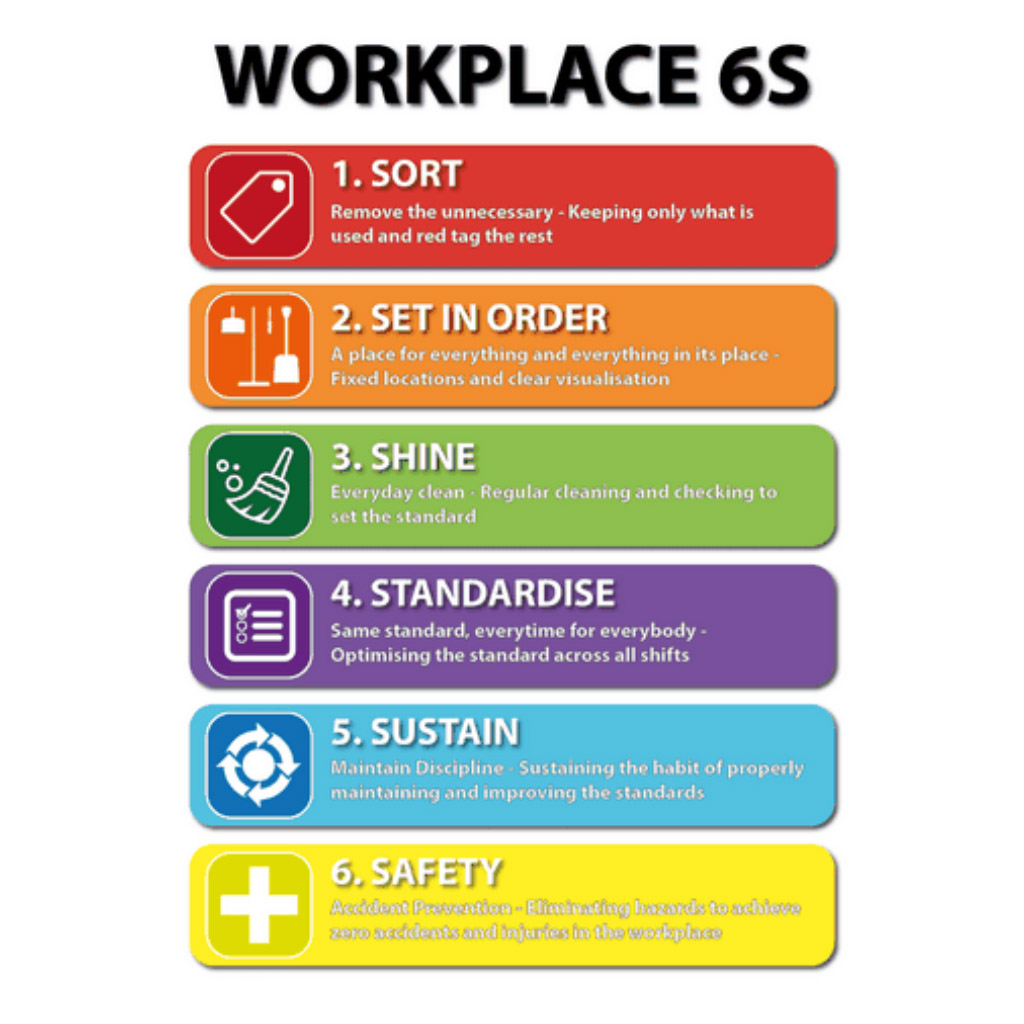 Use this poster to sustain 6S in workplace, this poster will remind employees to actively be thinking about 6S and how they can make sure they keep their workplace up to standard.