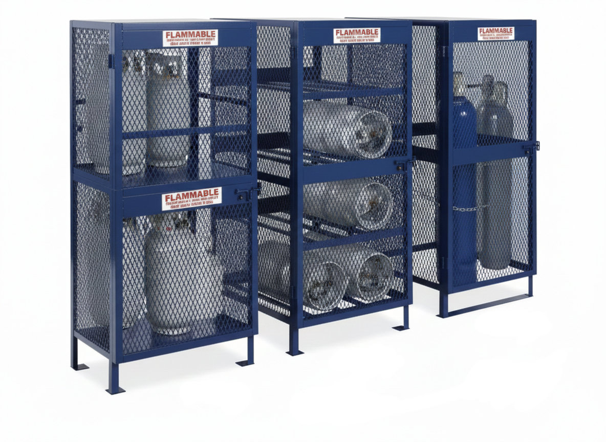 Safe, secure outdoor storage for flammable gas cylinders.