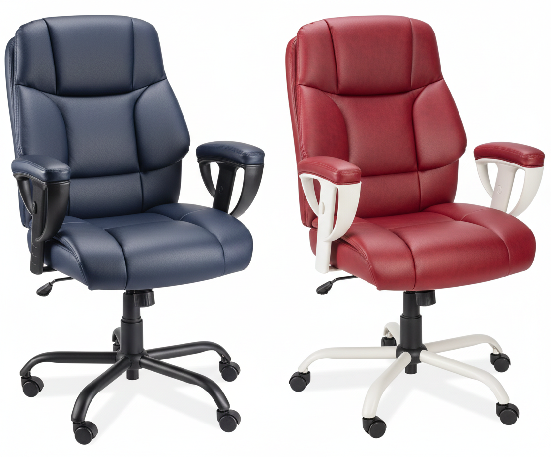 Move up to the captain’s chair. Super-sized comfort. Heavy-duty steel base with giant 450 lb. capacity. Thick, bonded leather over high-density molded foam. 5 1/2″ thick seat with 5 1/2″ pillowtop back. Adjustable armrests with extra-thick padding.