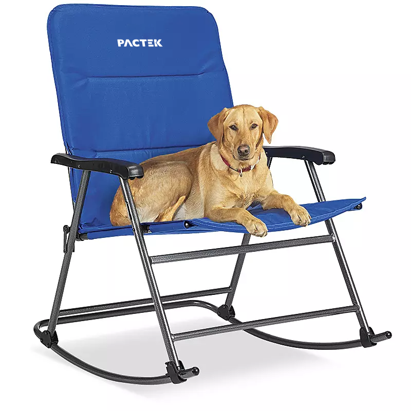 Outdoor rocking chair built for a lumberjack but cozy enough for a queen. 29″ wide padded seat. Folds flat for storage. Water-resistant polyester fabric. Sturdy 1″ steel tubing with locking frame. 600 lb. capacity.