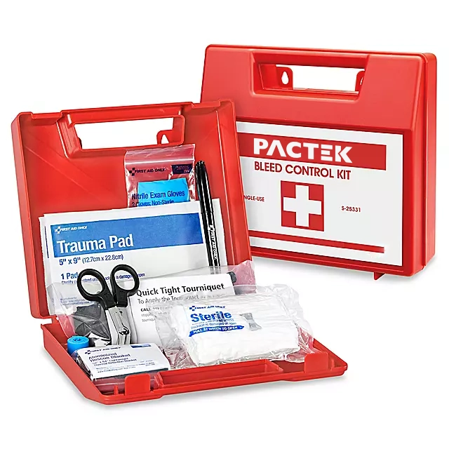 Stop life-threatening blood loss before professional help arrives. Plastic kit includes tourniquet, mylar blanket, trauma dressing, trauma pads, nitrile gloves, bandage shears and more. Wall mountable.