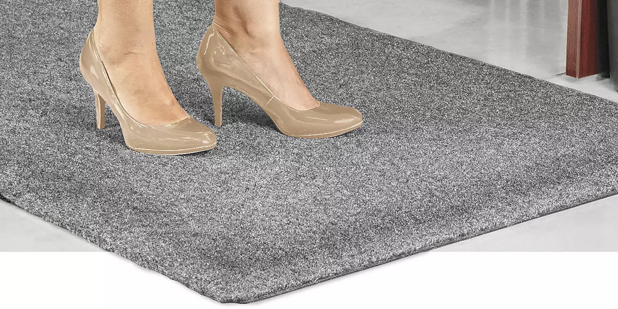 Plush fibers trap dirt. Thick, sponge foam cushions feet. Recommended for use at restaurants and hotels. Tough Olefin fibers. Resists cuts and punctures from heels and chairs. Beveled edges. Non-skid vinyl backing.