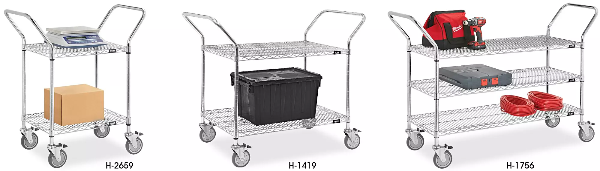 Tough, maneuverable wire carts move large loads. Recommended for labs, food service, offices and hospitals. Easy to clean; won’t collect dirt. Adjustable shelf height. 5″ lockable swivel casters. Optional Wire Shelving Accessories available.