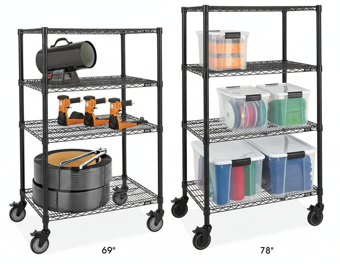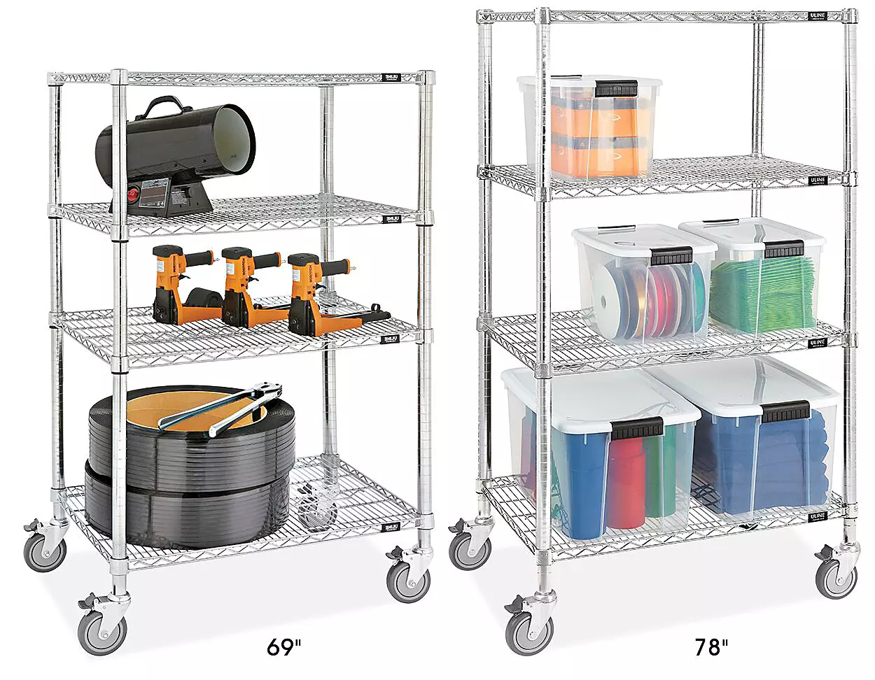 Tough, heavy-duty maneuverable carts move large loads. 4 Shelf – Longer posts give more space for larger items. Greater capacity for fewer trips. Easy to clean; won’t collect dirt. Shelves adjust in 1″ increments. 5″ locking swivel casters included. NSF Certified. Optional Wire Shelving Accessories available.