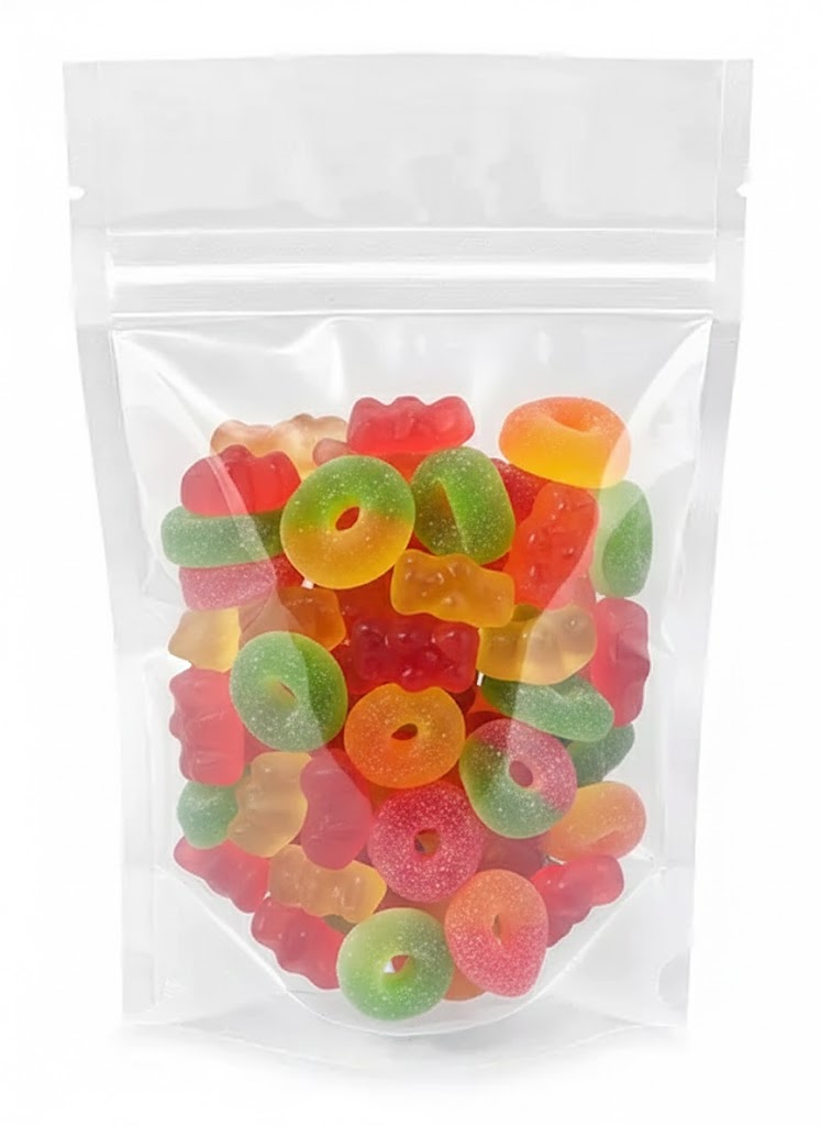 Airtight zippered display pouches lock in freshness. Clear front and back provide total product visibility. Thick barrier material protects items from moisture, gas and odor. Heat sealable above tear notches. FDA and USDA compliant.