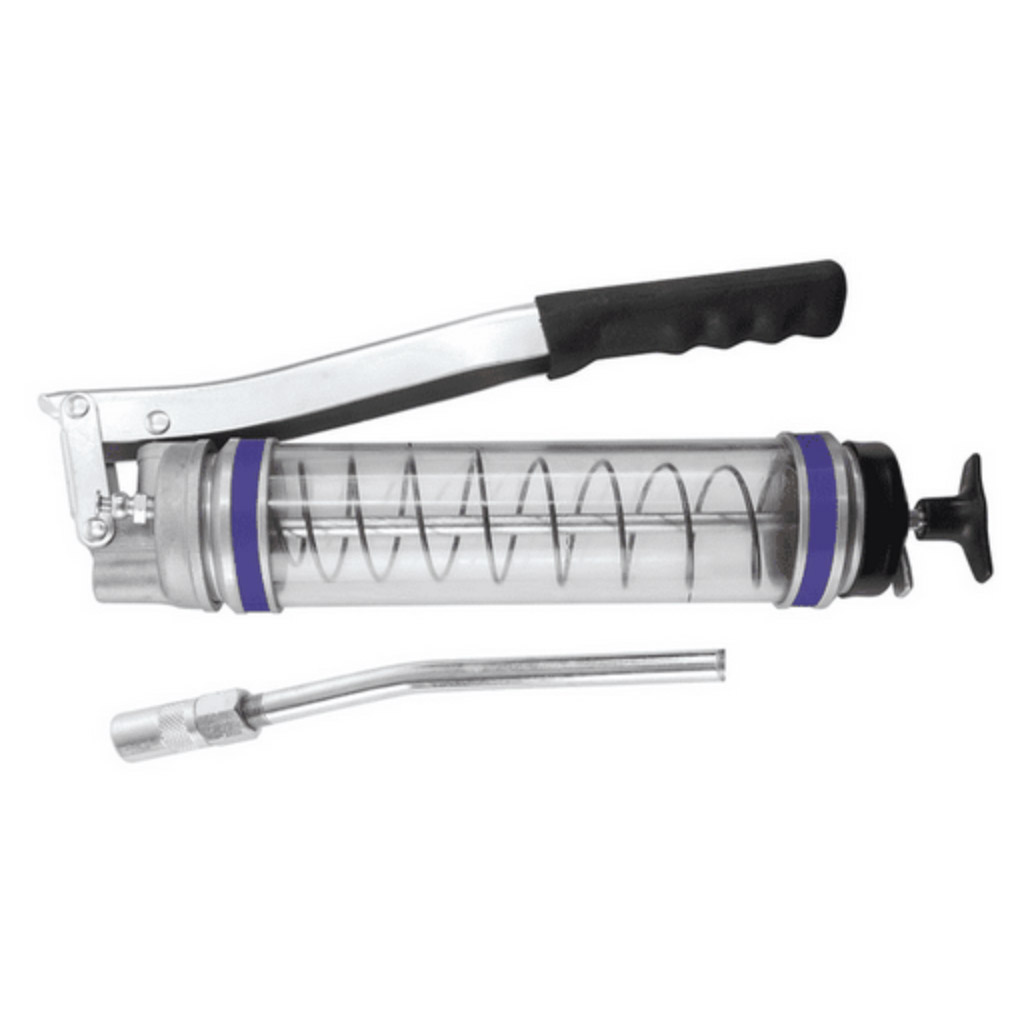 The transparent barrel allows the operator to view the cartridge/grease in the grease gun at all times. The clear barrel is constructed from polycarbonat
