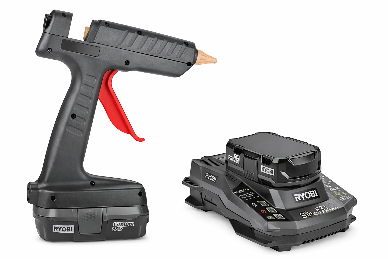 Go anywhere, glue anything. Runs 90 minutes on full charge. 1 hour recharge. Backup plug for use between charges. Lithium ion battery and charger included.