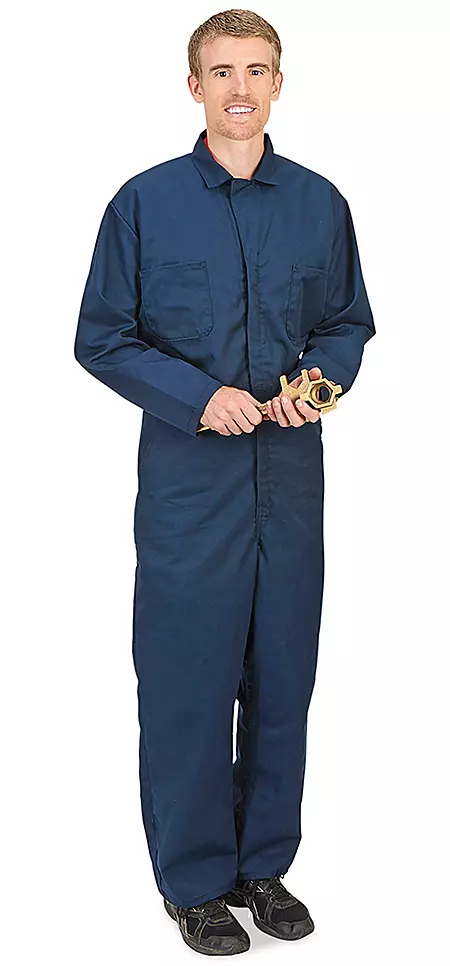 Full-length coverage for mechanics and machinists. Protects against grease, oil and grime. Heavy-duty, 2-way zipper. 5 pockets. Washable poly/cotton blend.
