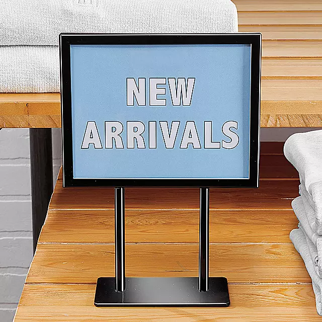 Display custom messages on counters, end caps and display cases. Double-sided, top-opening frame with dual 4″ stems. Steel frame with felt-lined base. Clear Inserts – Scratch-resistant plastic protects signs.